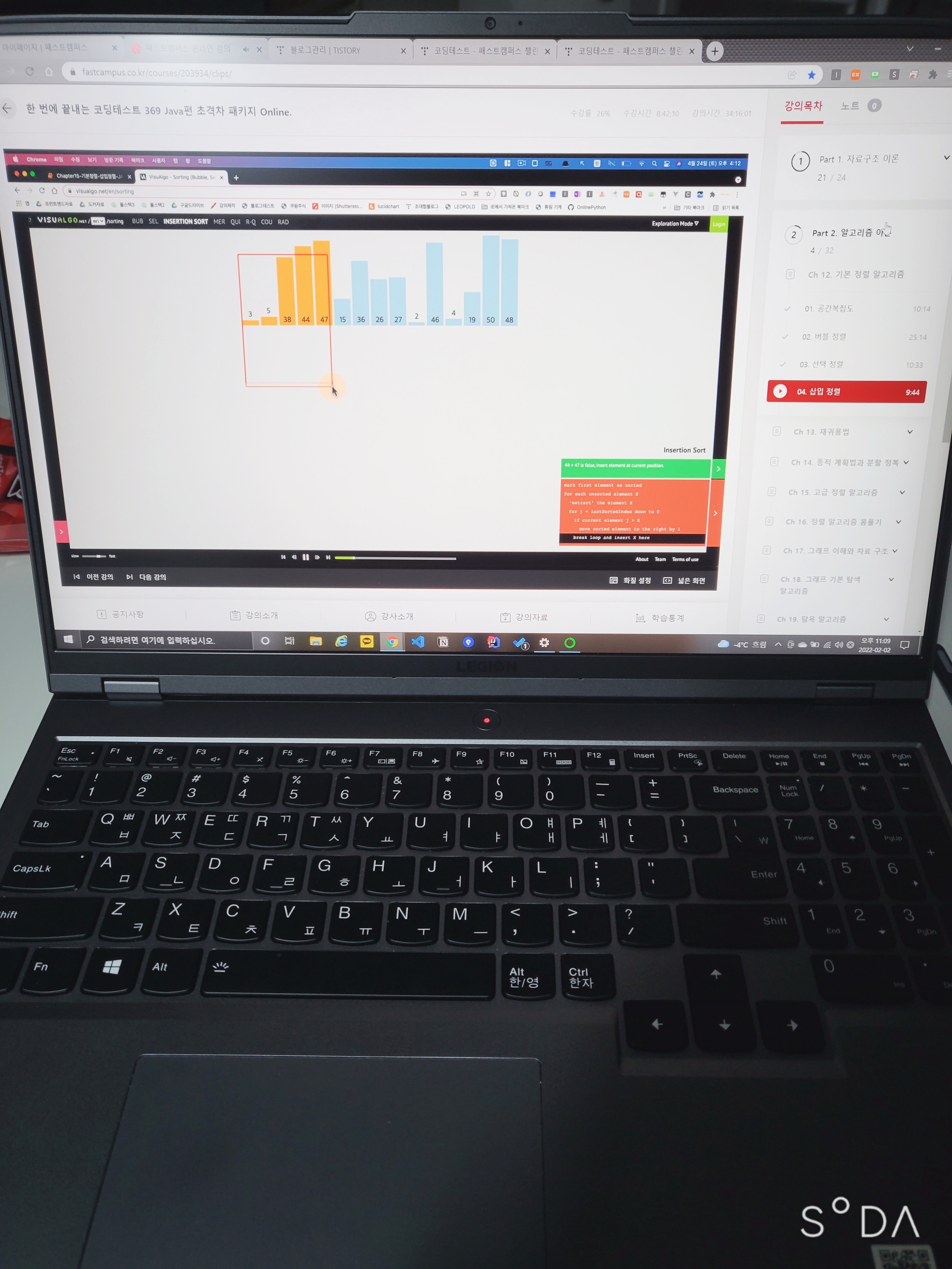 삽입 정렬을 끝으로 기본 정렬 알고리즘 강의가 끝났다. 이후에 고급 정렬 알고리즘에서는 병합 정렬과 퀵 정렬을 배우게 된다. 기본 정렬 알고리즘은 구현하기 쉽다고 하니 여러 번 직접 작성해보며 바로바로 짤 수 있도록 익혀놓아야겠다.
