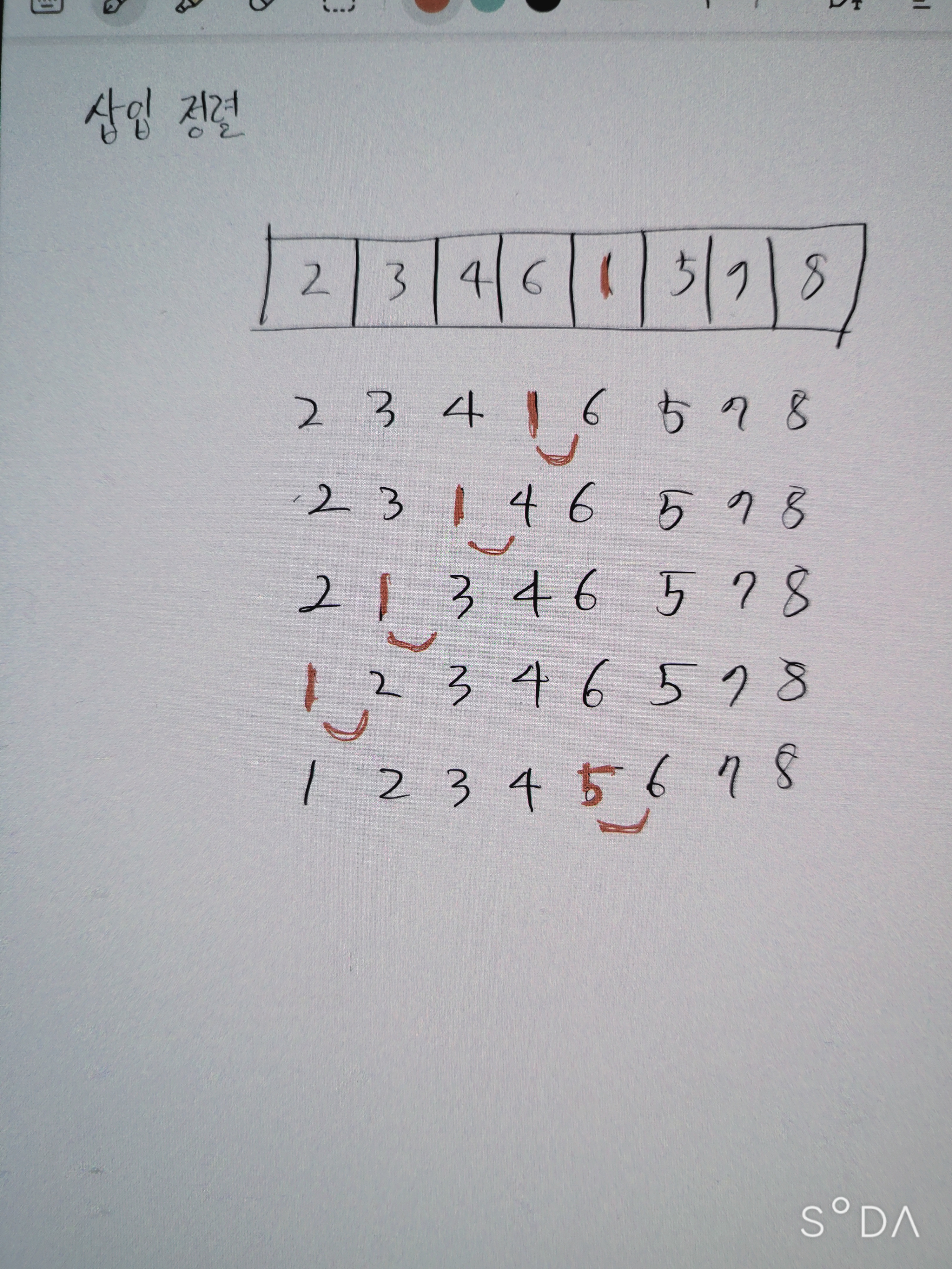 아래와 같은 순서에 따라 삽입 정렬 알고리즘이 진행된다.