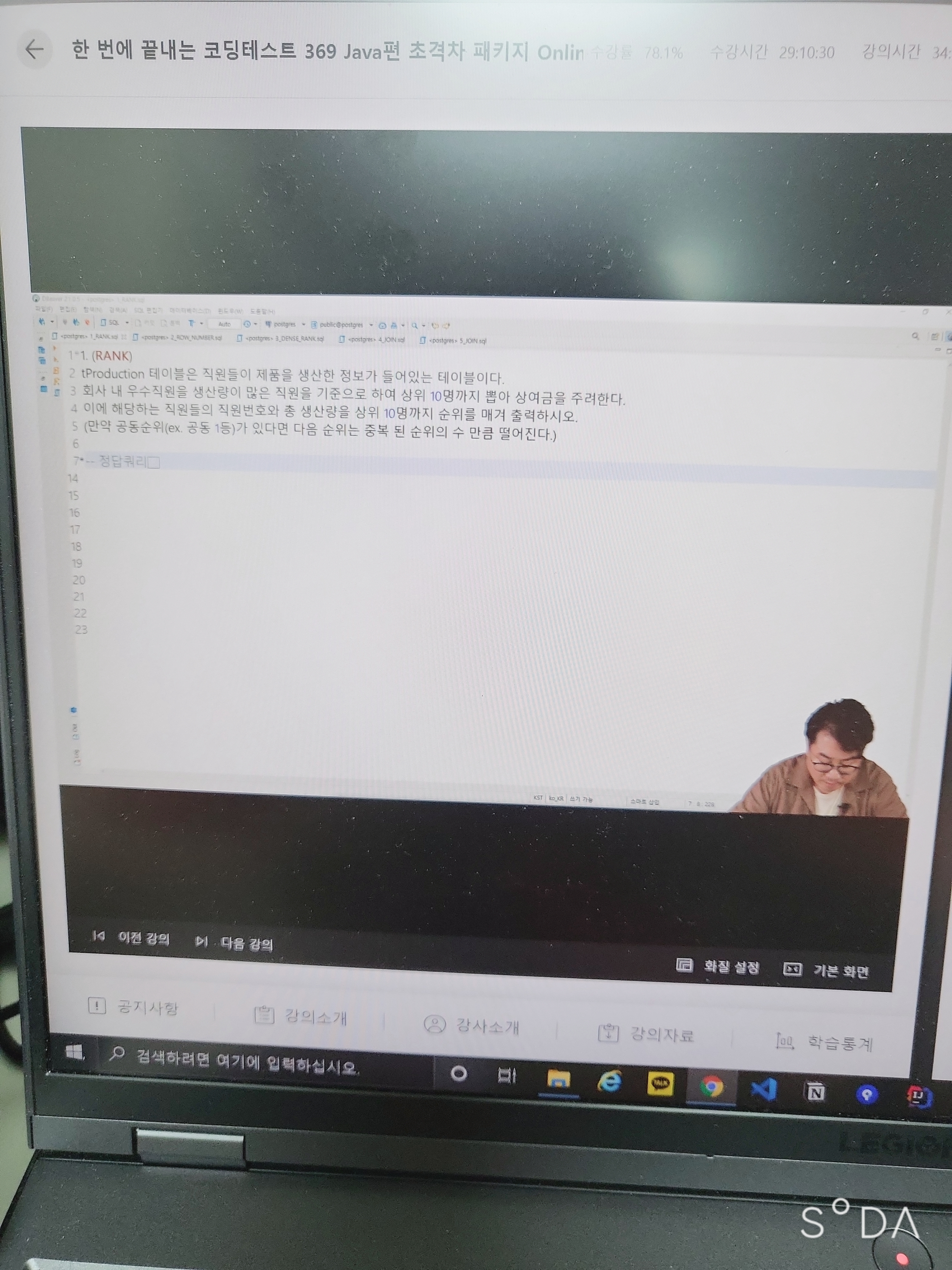 이에 해당하는 직원들의 직원코드와 총생산량을 상위 10명까지 순위를 매겨 출력하시오.